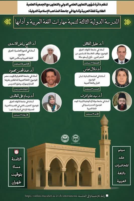 به همت مدیریت همکاری های علمی بین المللی با همکاری انجمن علمی دانشجویی زبان و ادبیات عربی دانشگاه بین المللی مذاهب اسلامی "سومین مدرسه بین المللی مهارت افزایی زبان و ادبیات عربی" با سخنرانی اساتید برجسته از کشورهای عراق، لبنان، هند، و مصر به صورت مجازی از 21 تا 26 شهریور 1404 با استقبال جمعی از اساتید و دانشجویان داخلی و خارجی برگزار شد.