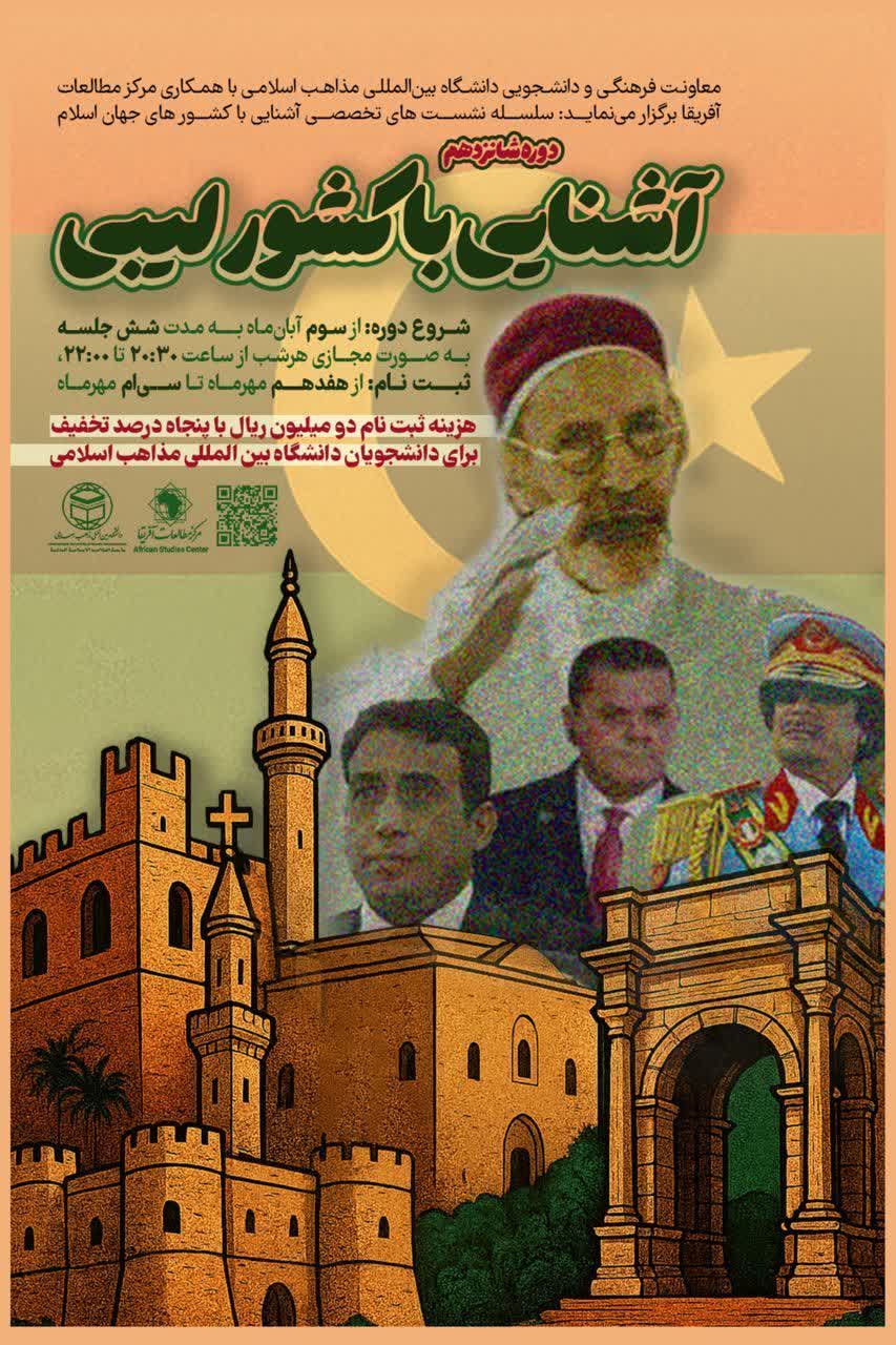 سلسله نشست‌های مجازی تخصصی آشنایی با کشورهای اسلامی  دوره شانزدهم: آشنایی با  کشور لیبی همراه با اعطای گواهی حضور ثبت نام از: ۱۶ تا ۳۰ مهرماه شروع دوره از ۳ آبان‌ماه