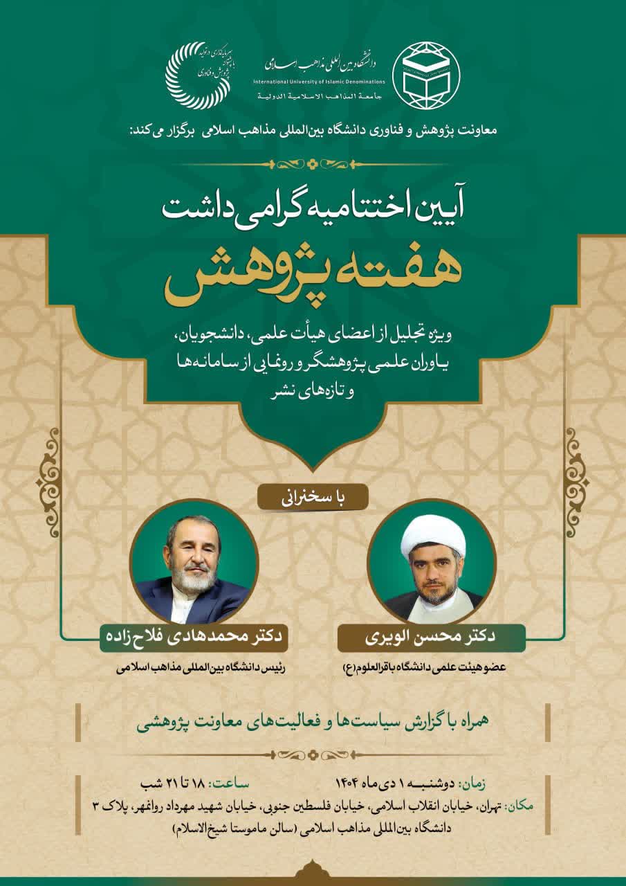 معاونت پژوهش دانشگاه بینالمللی مذاهب اسلامی، در راستای پاسداشت مقام پژوهش و پژوهشگران، آیین اختتامیه گرامیداشت هفته پژوهش را برگزار مینماید.