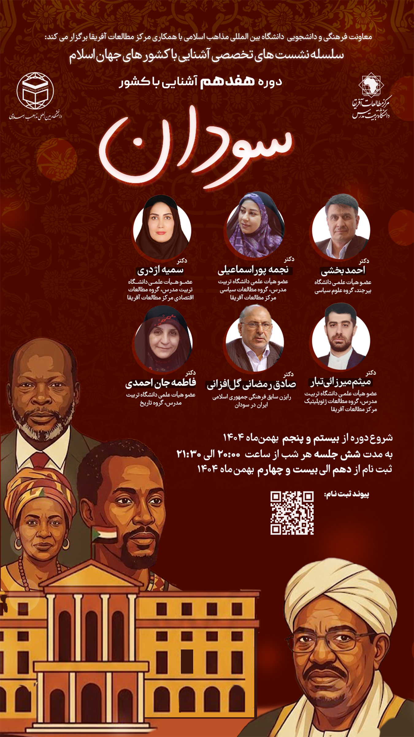 معاونت فرهنگی و دانشجویی دانشگاه بین المللی مذاهب اسلامی با همکاری مرکز مطالعات آفریقا برگزار می کند: سلسله نشست های تخصصی آشنایی با کشور های جهان اسلام دوره هفدهم:آشنایی با کشور سودان(به صورت مجازی)